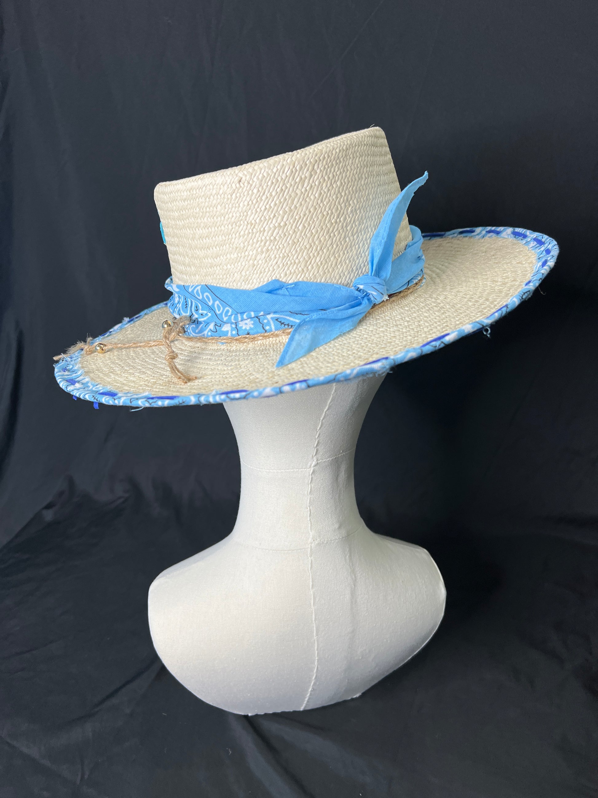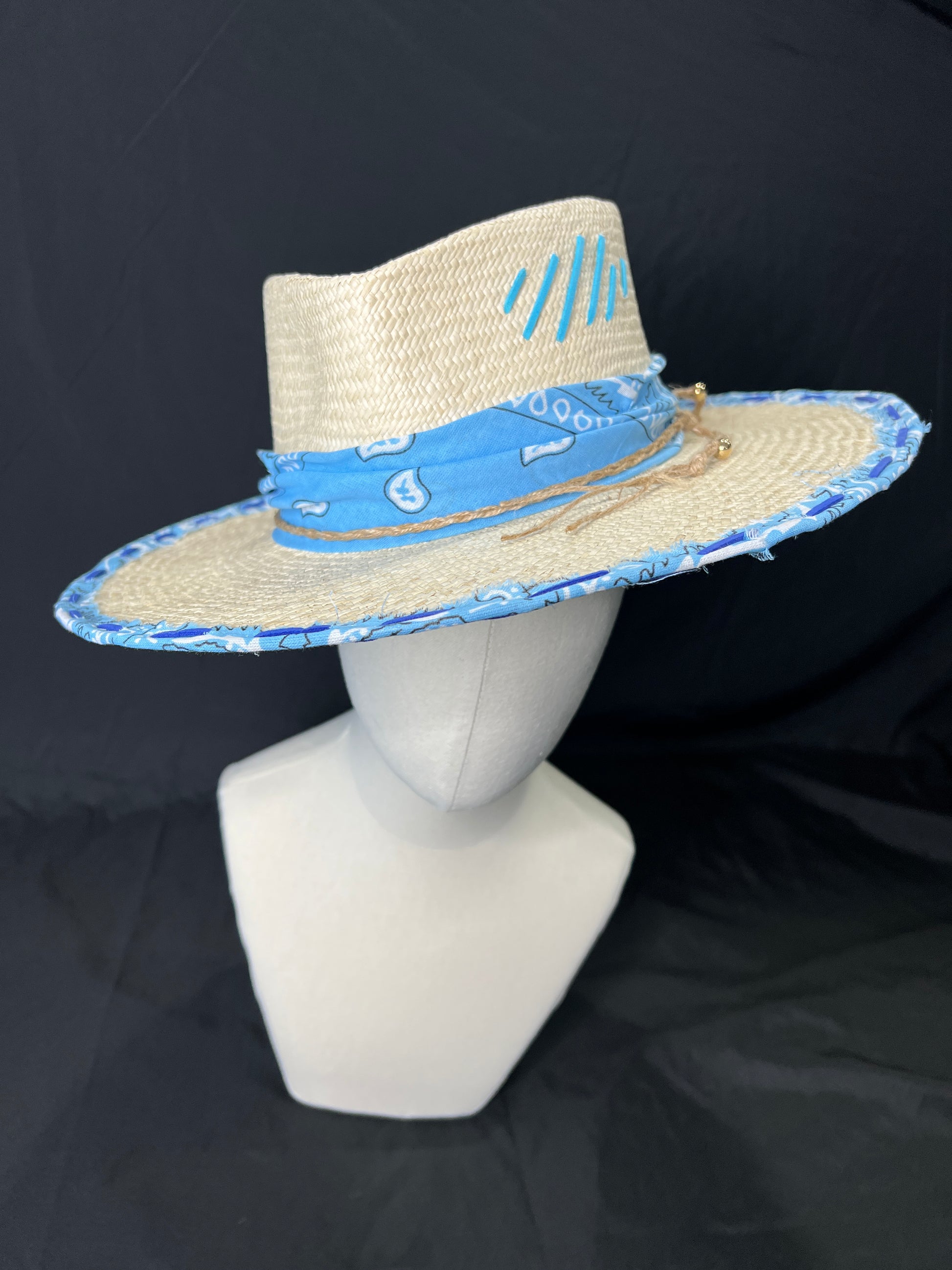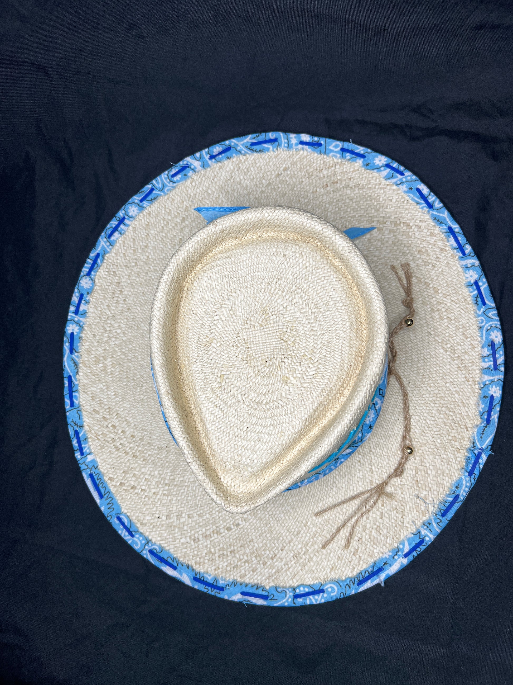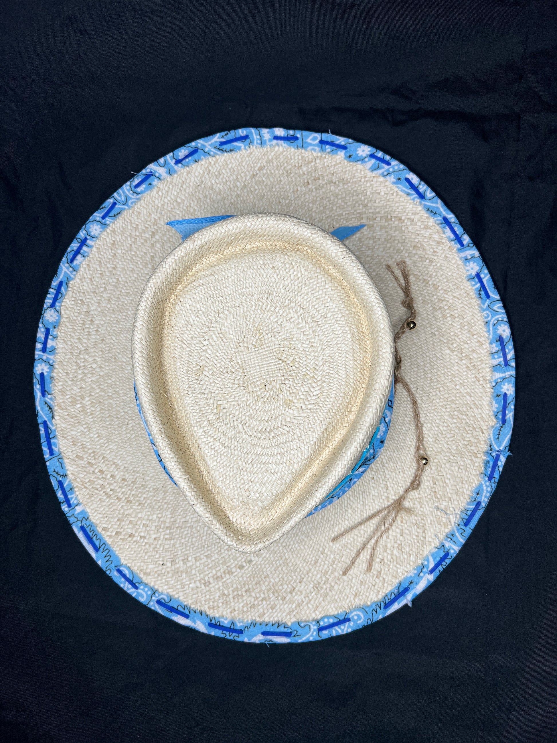 Un tocco di libertà e stile boho si fondono in Blue Bandana Breeze, il cappello in paglia perfetto per le giornate di sole. Realizzato a mano con intreccio naturale, questo cappello presenta una tesa ampia decorata con una vivace rifinitura in cotone azzurro stampato. Il nastro annodato in stile bandana aggiunge un carattere fresco e ribelle, mentre il cordino in juta naturale con perline dorate completa il look con un richiamo artigianale.