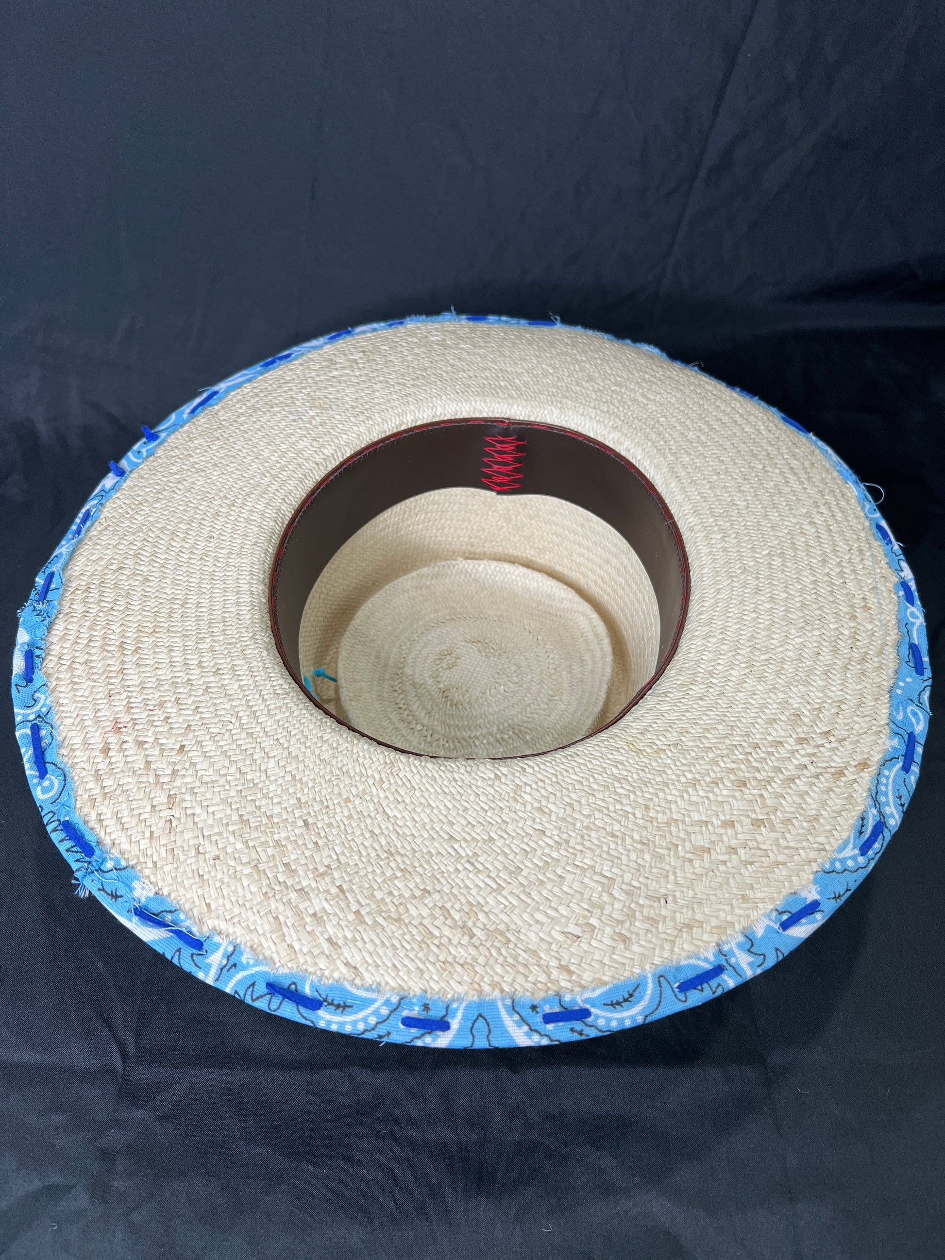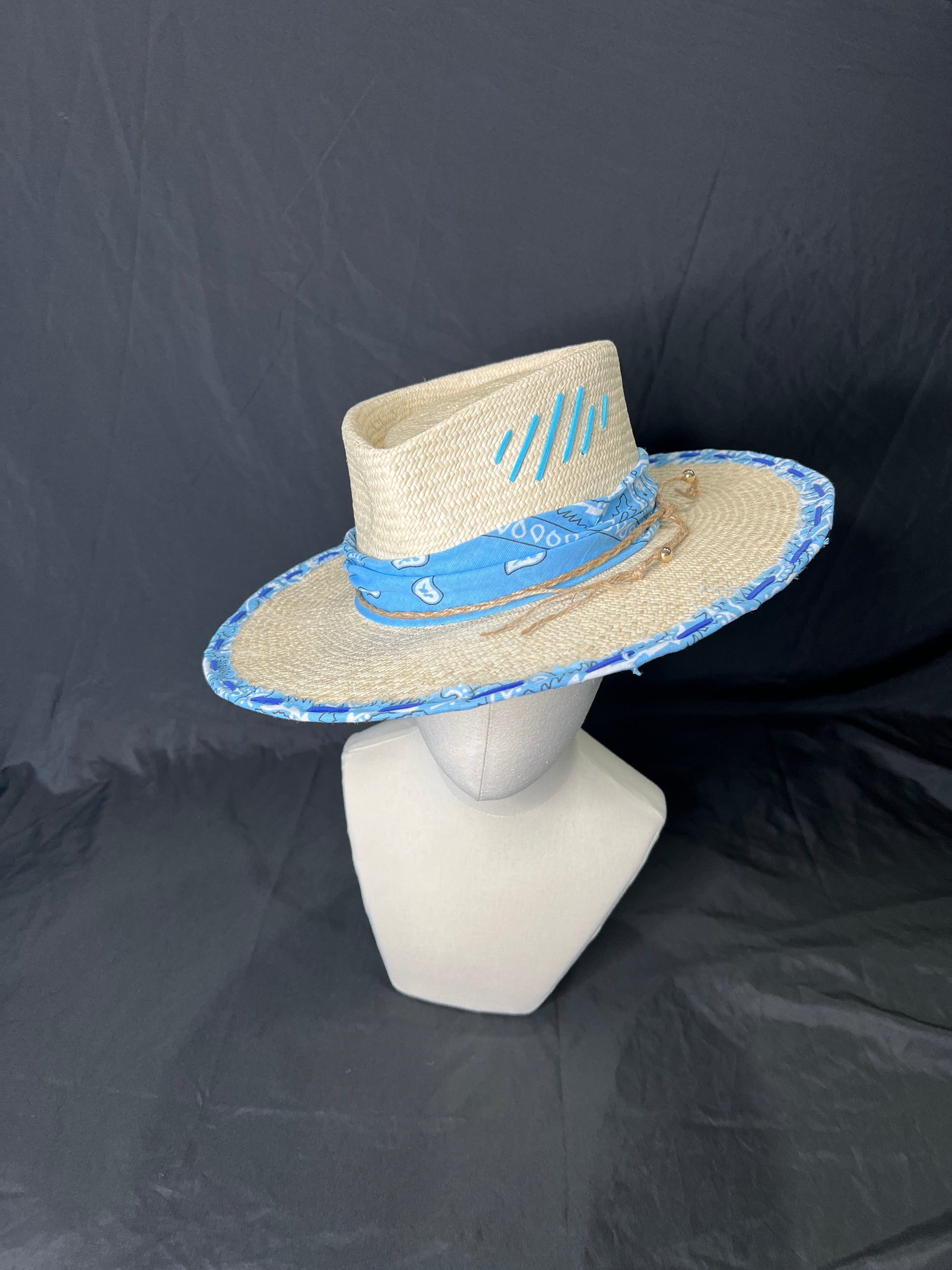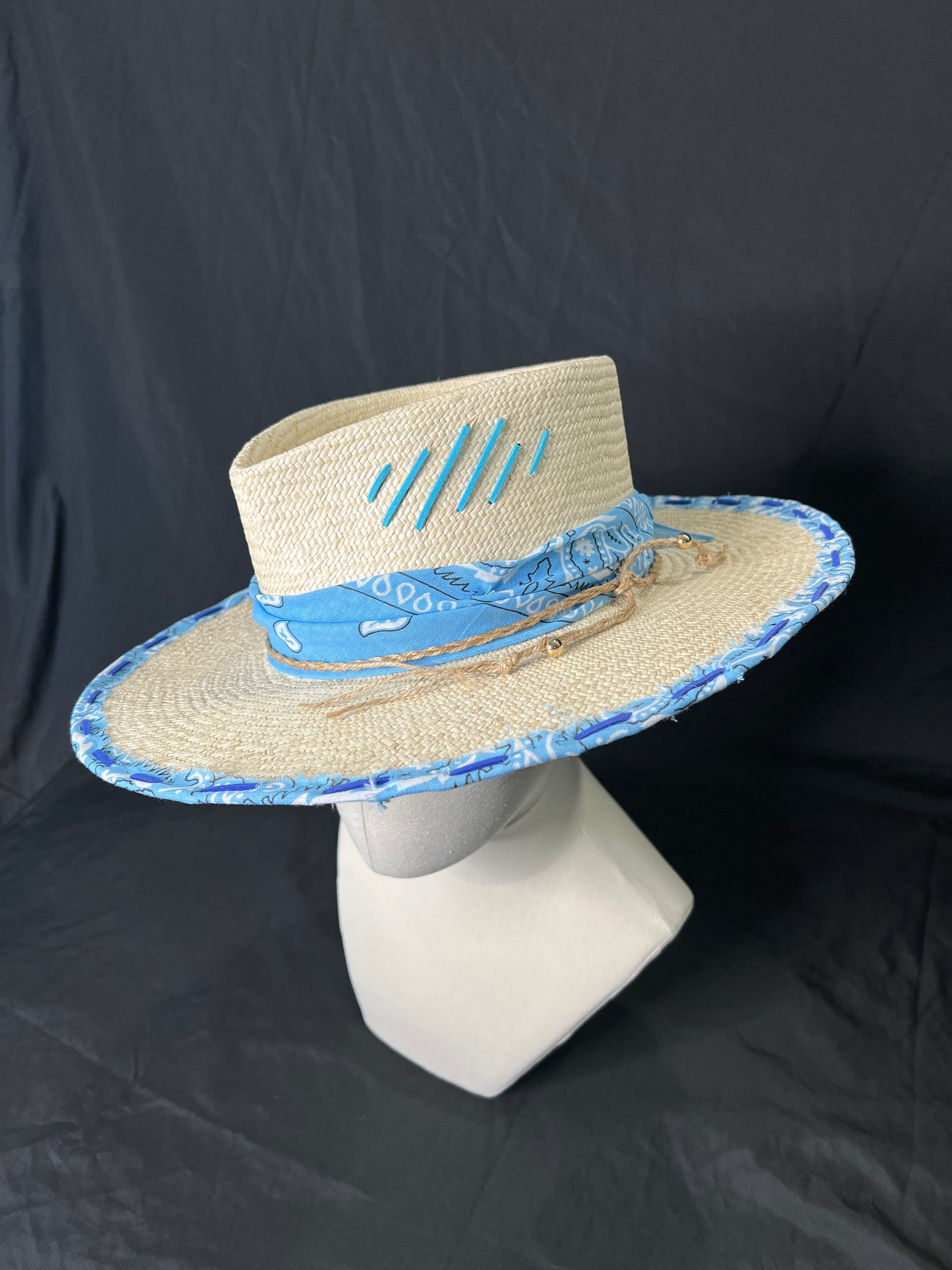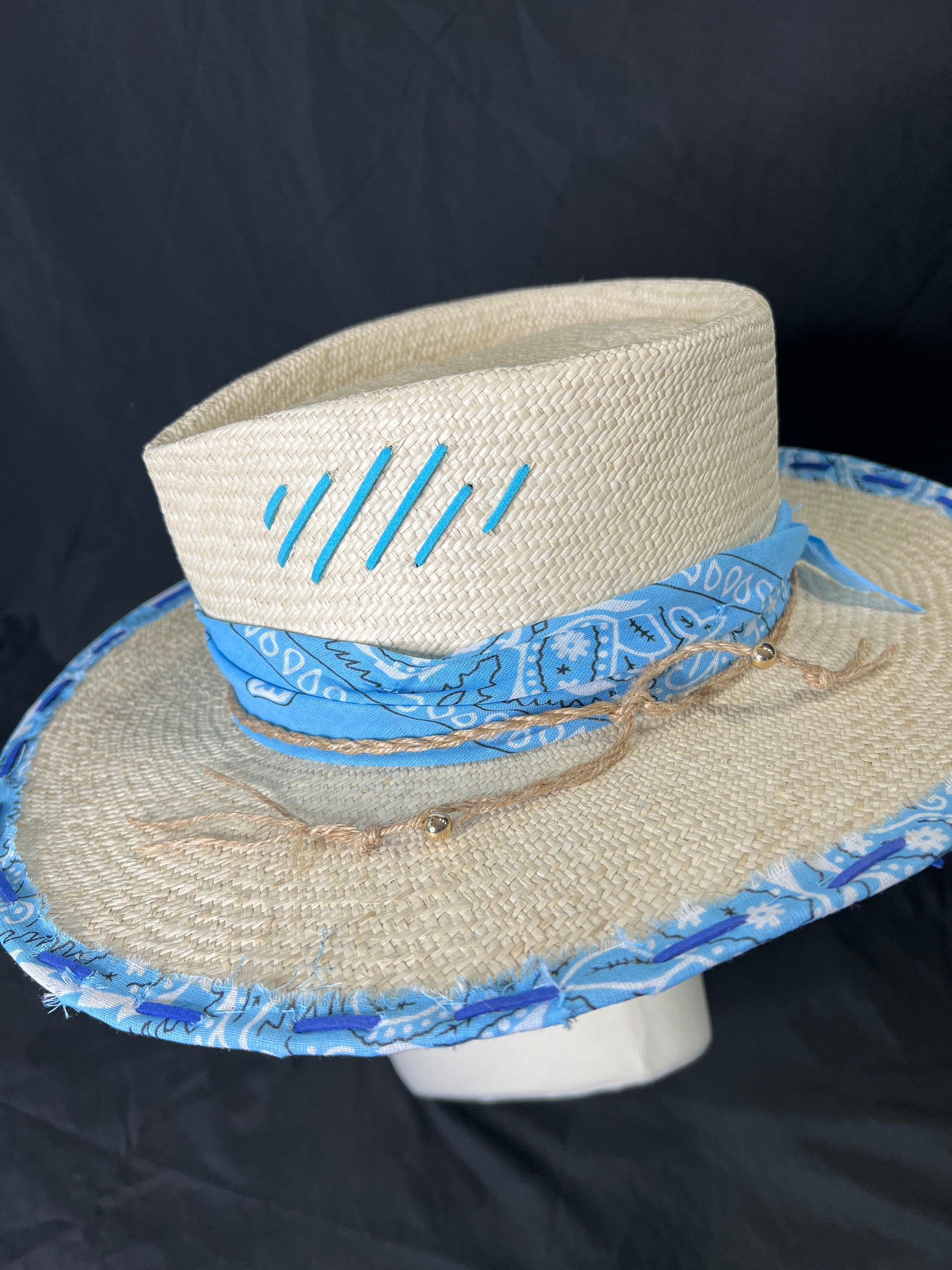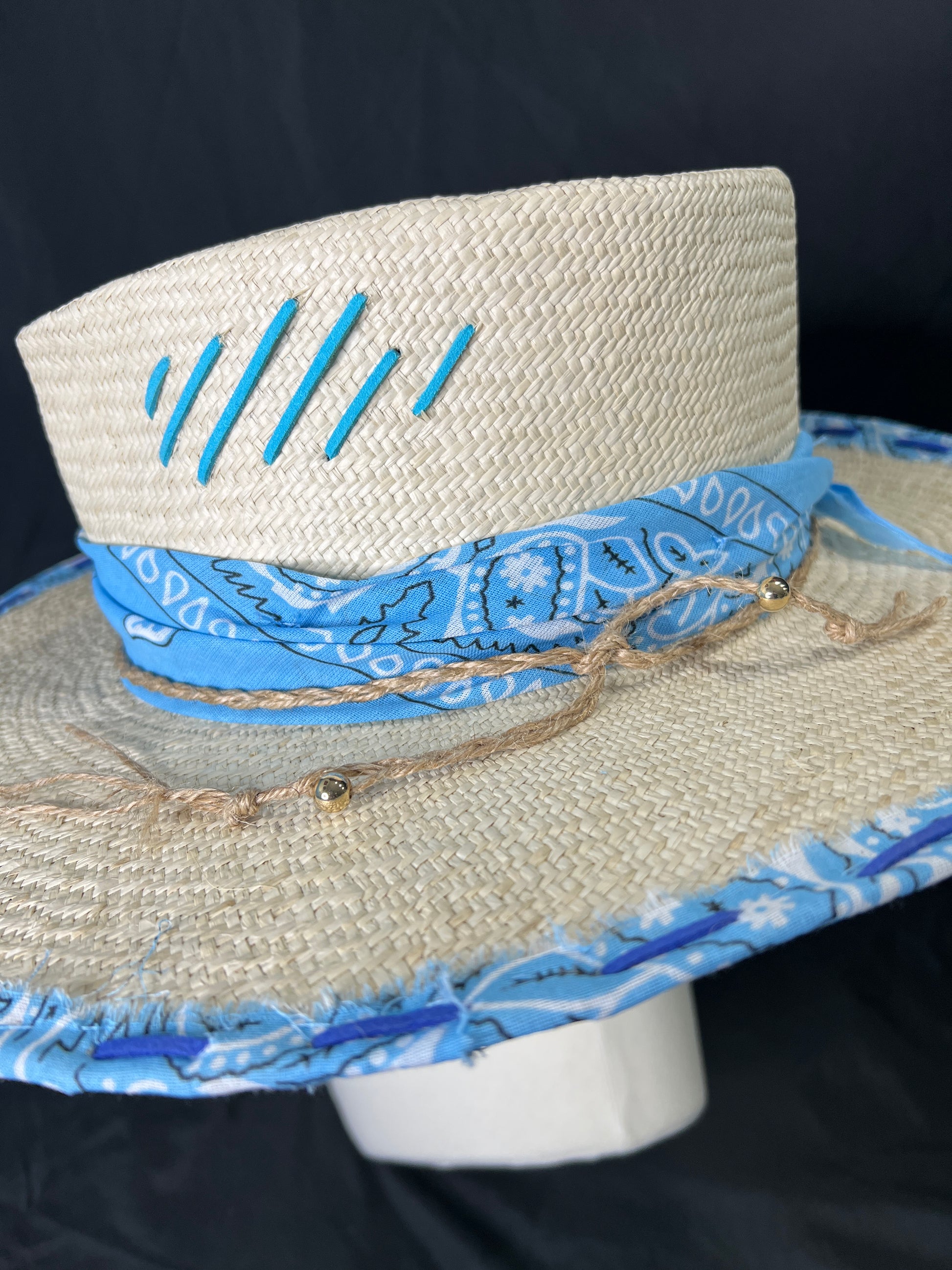 Un tocco di libertà e stile boho si fondono in Blue Bandana Breeze, il cappello in paglia perfetto per le giornate di sole. Realizzato a mano con intreccio naturale, questo cappello presenta una tesa ampia decorata con una vivace rifinitura in cotone azzurro stampato. Il nastro annodato in stile bandana aggiunge un carattere fresco e ribelle, mentre il cordino in juta naturale con perline dorate completa il look con un richiamo artigianale.