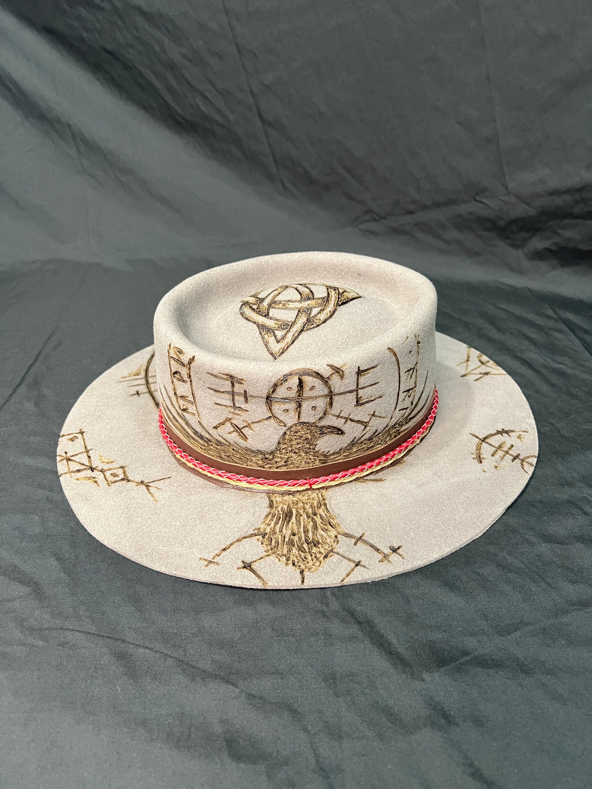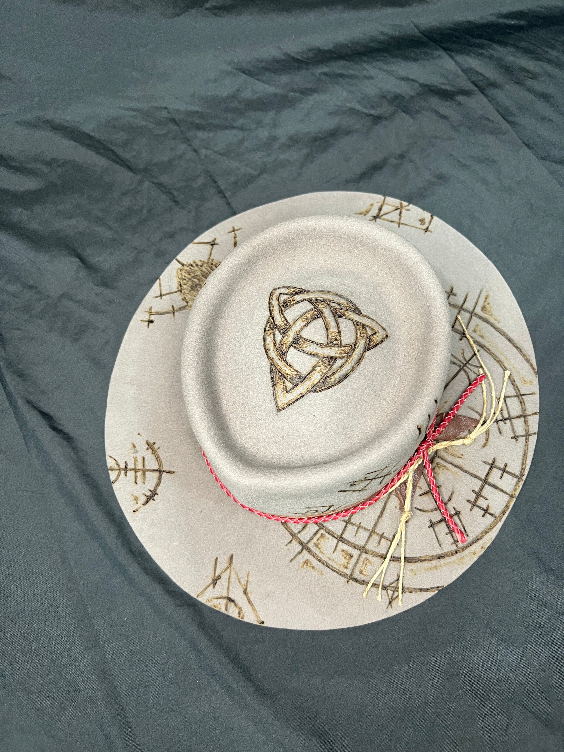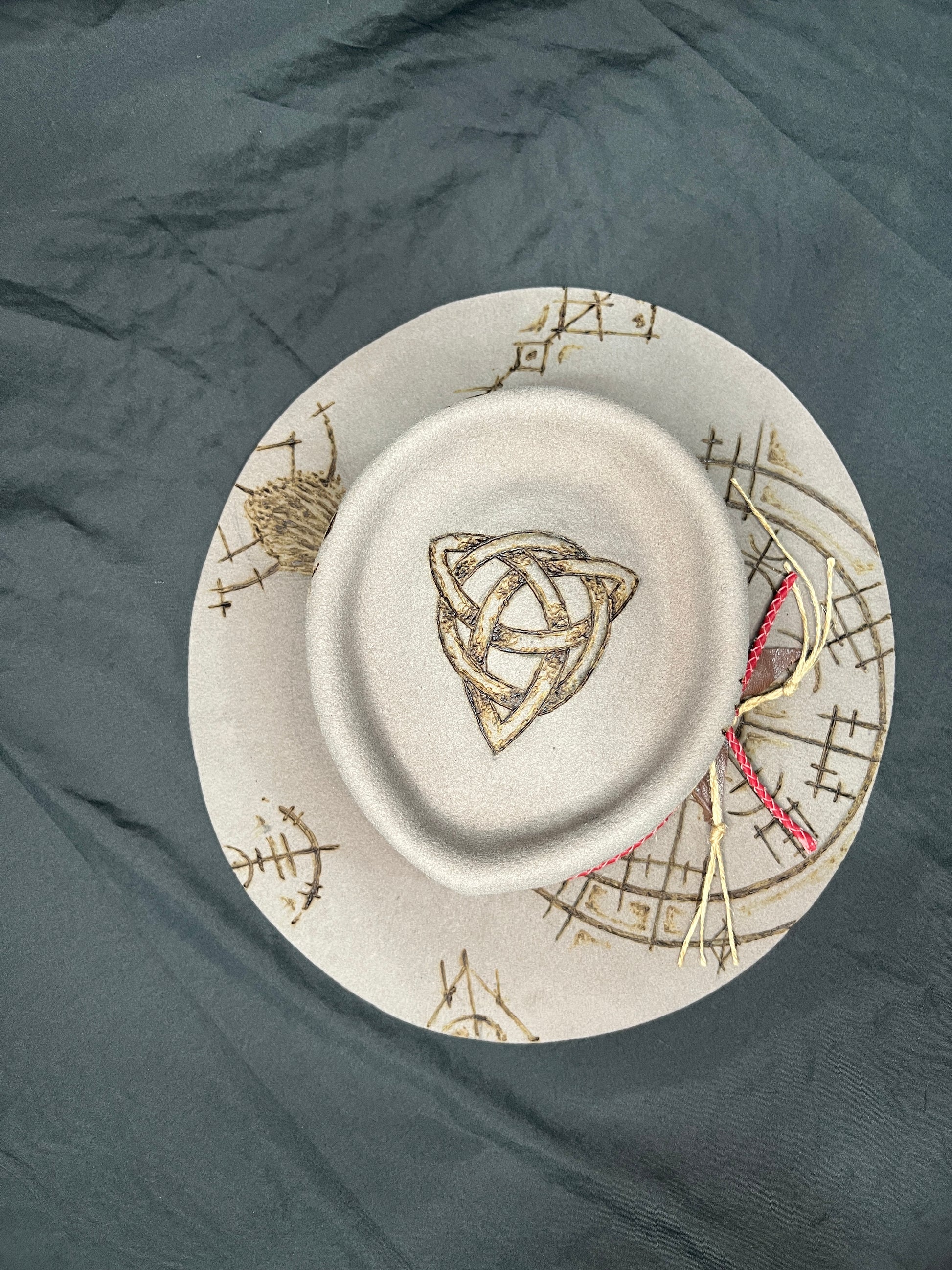 Un cappello unico, interamente realizzato a mano, dove l’antica simbologia celtica incontra l’arte della pirografia.