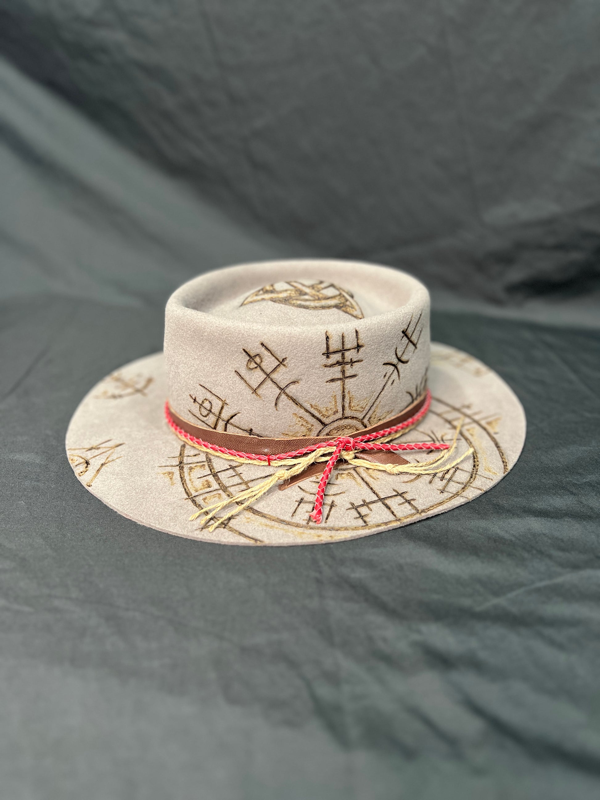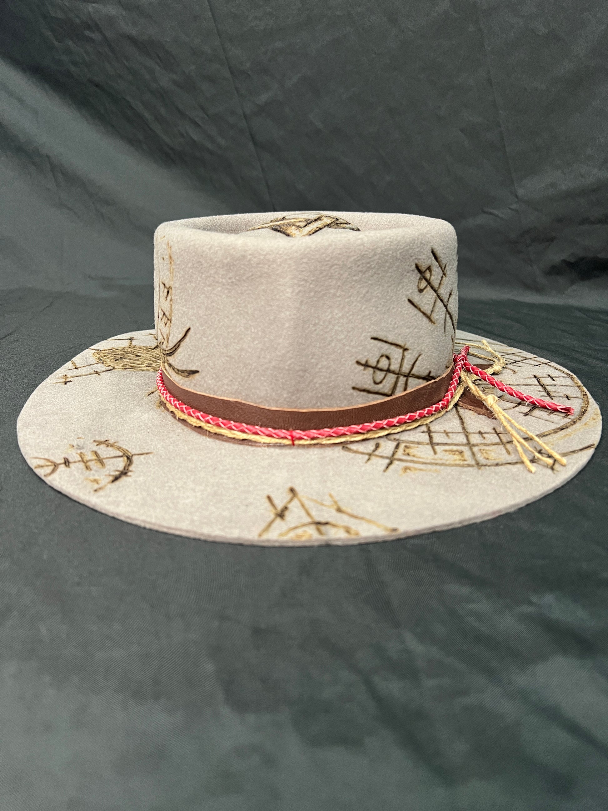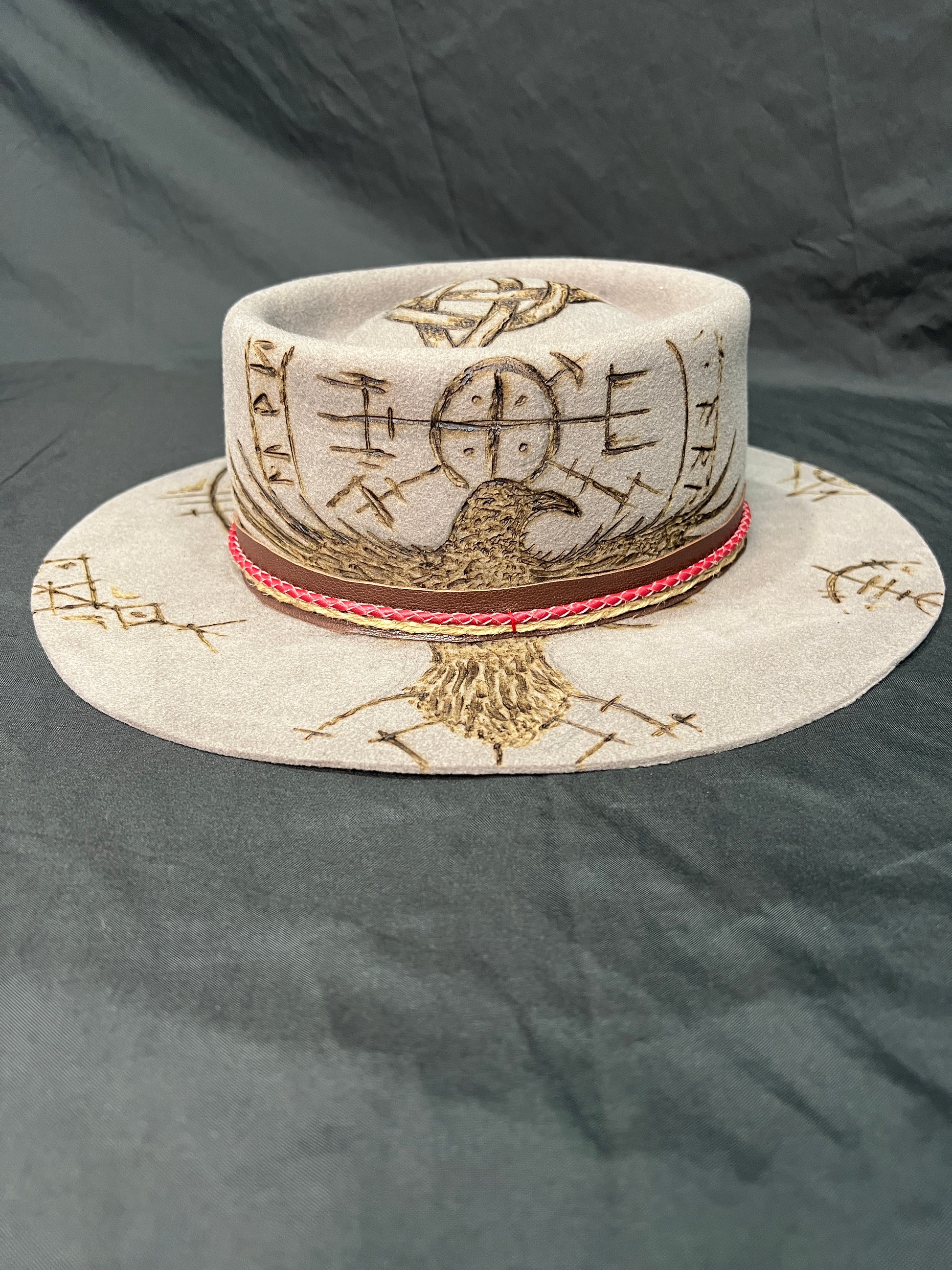 Un cappello unico, interamente realizzato a mano, dove l’antica simbologia celtica incontra l’arte della pirografia.