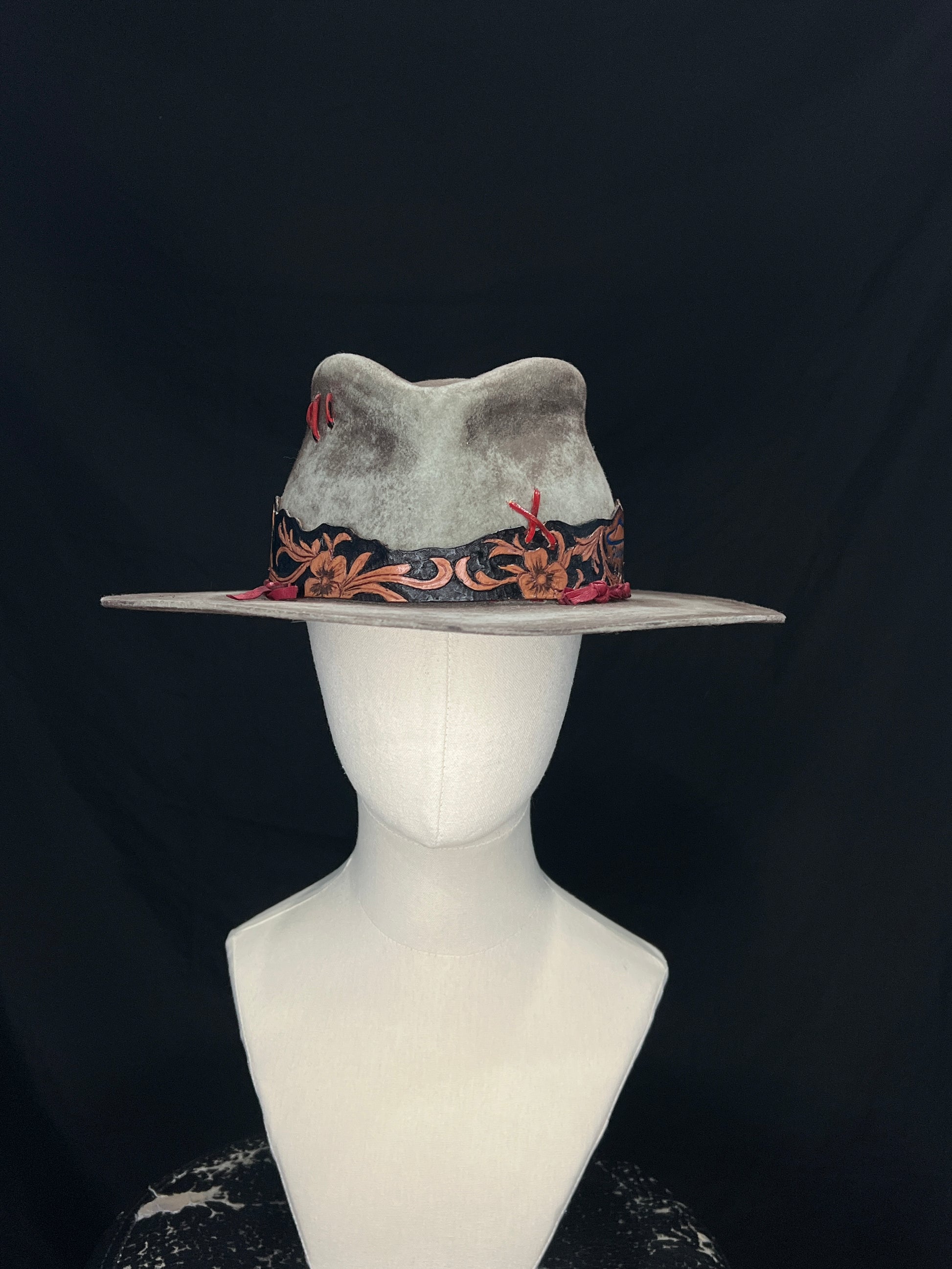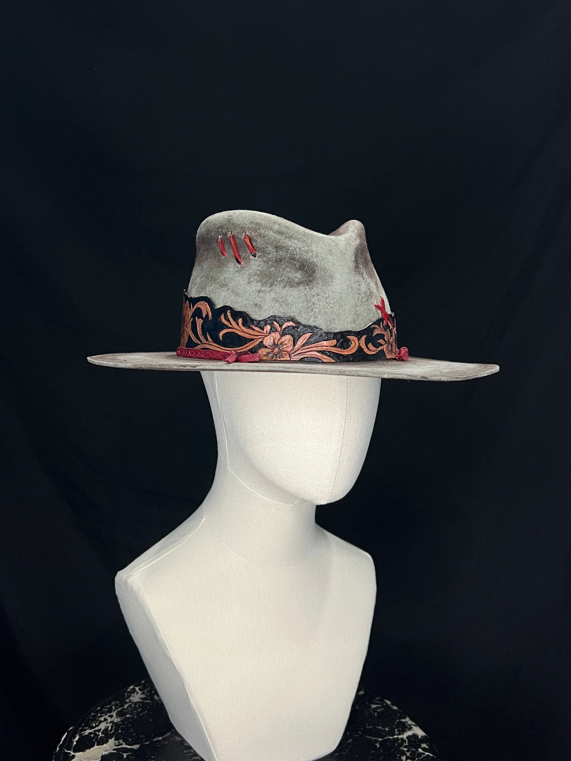 Realizzato interamente a mano, questo fedora nasce da un feltro lavorato e patinato con cura, per ottenere un tono grigio profondo, vissuto ed elegante.