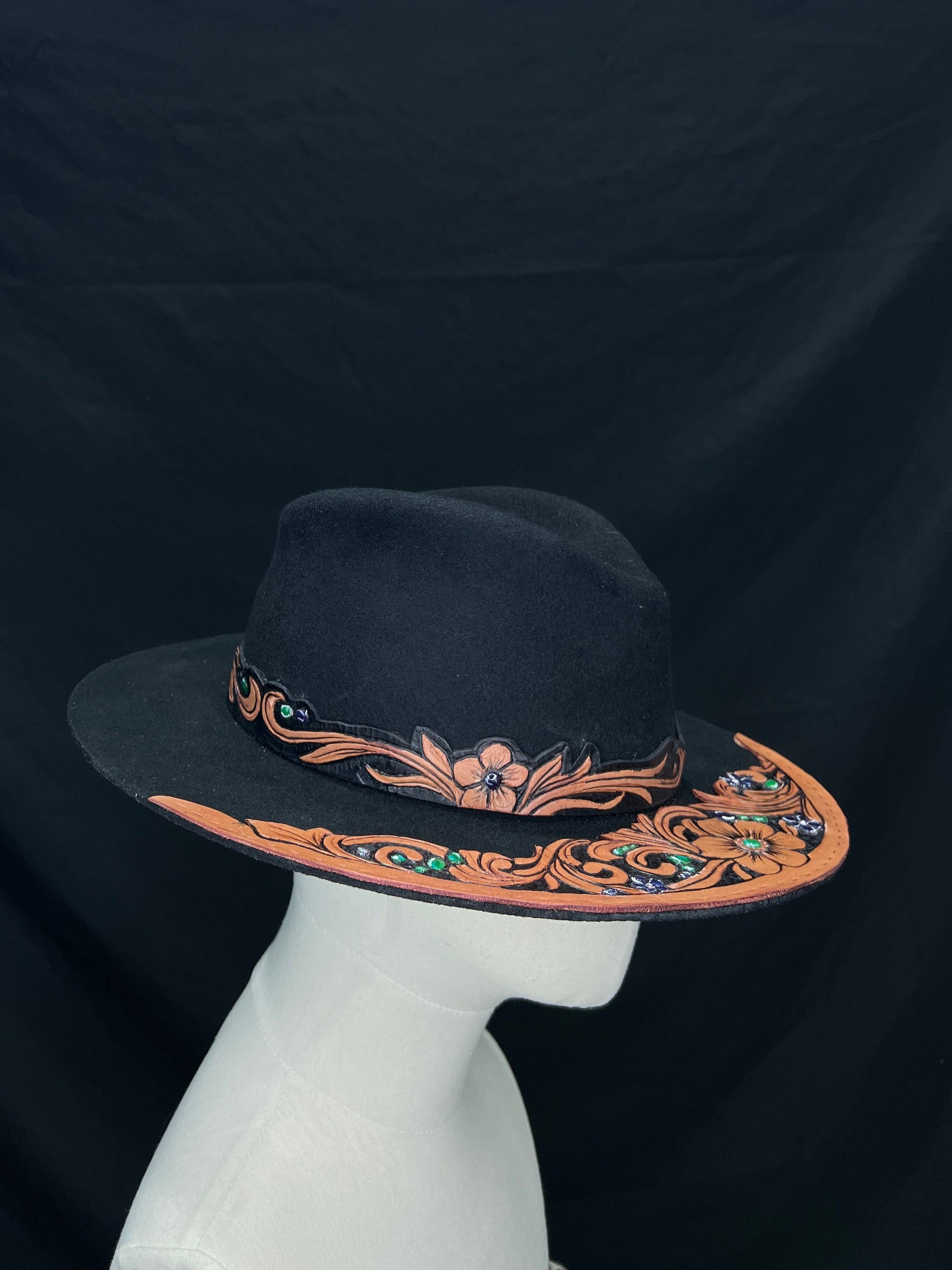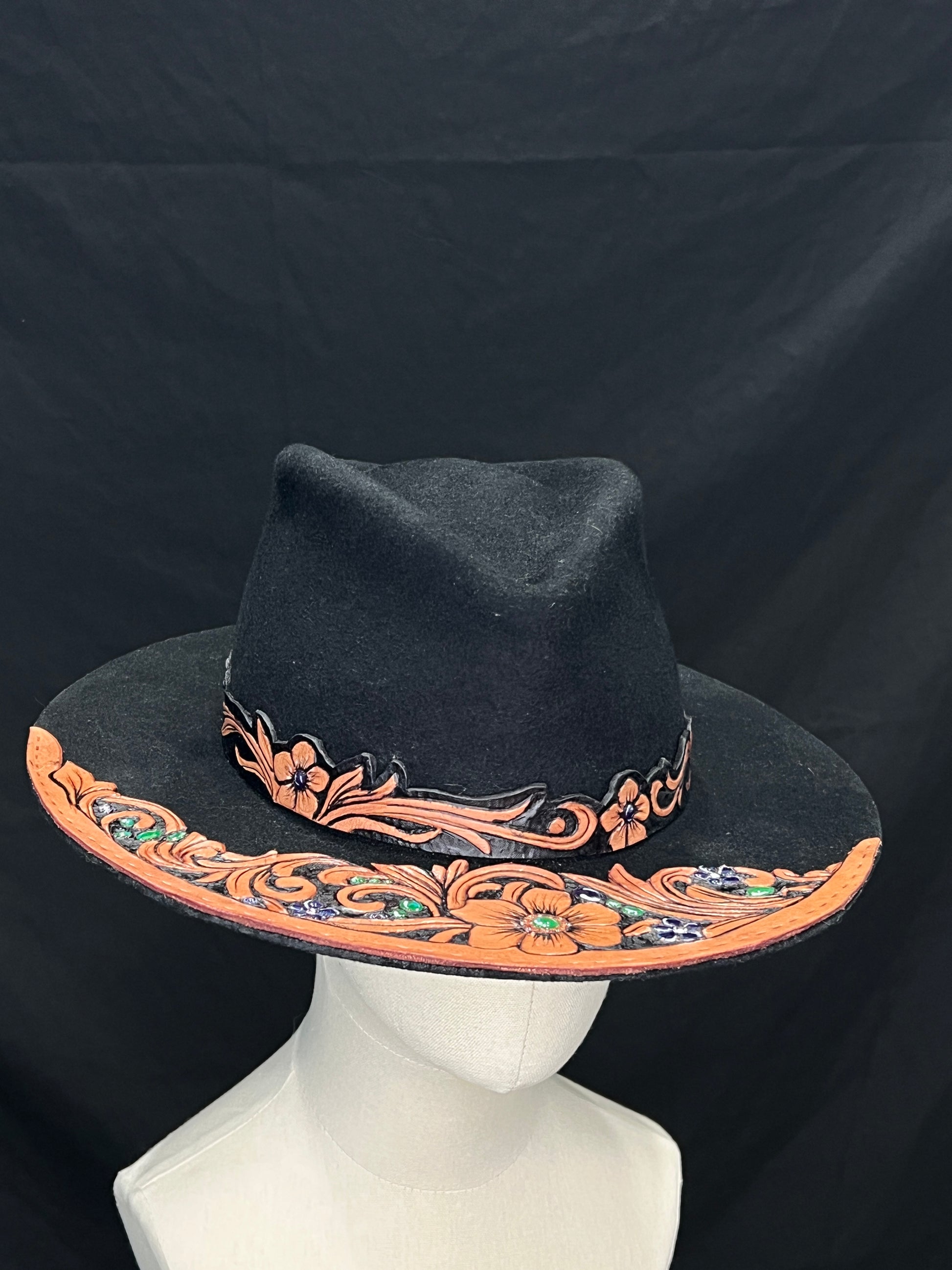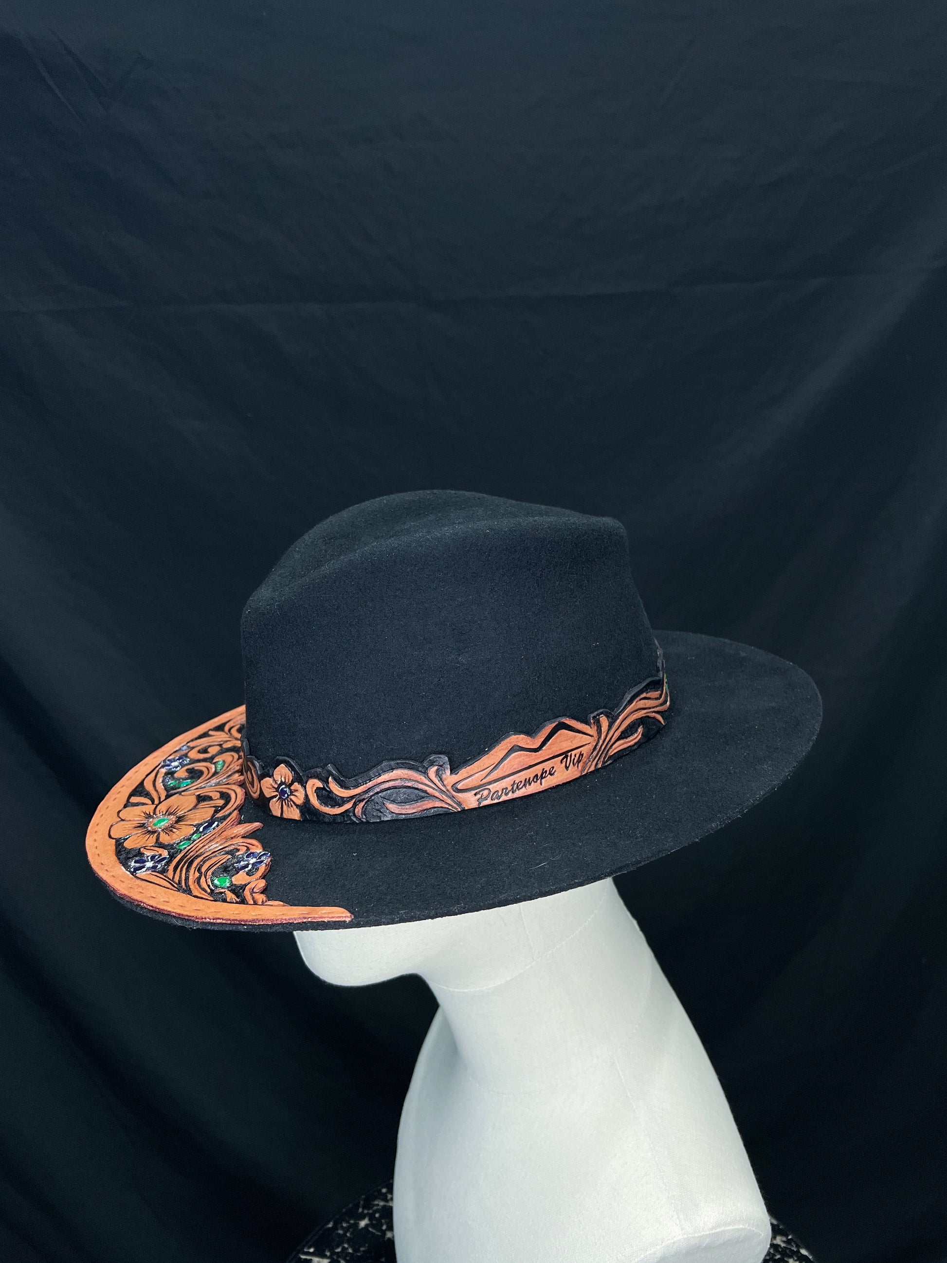feltro nero profondo, pelle naturale scolpita con motivi floreali e barocchi, pietre verdi e blu incastonate a mano come piccoli frammenti di luce.