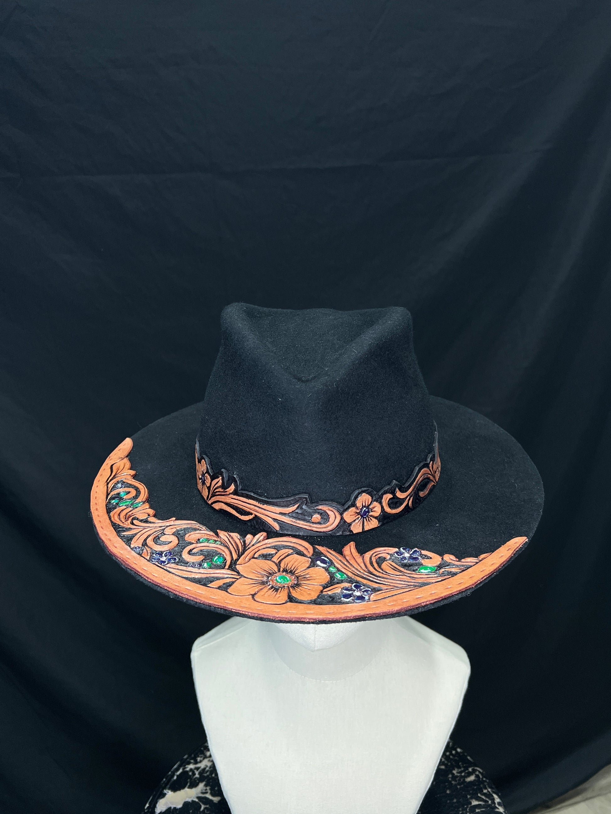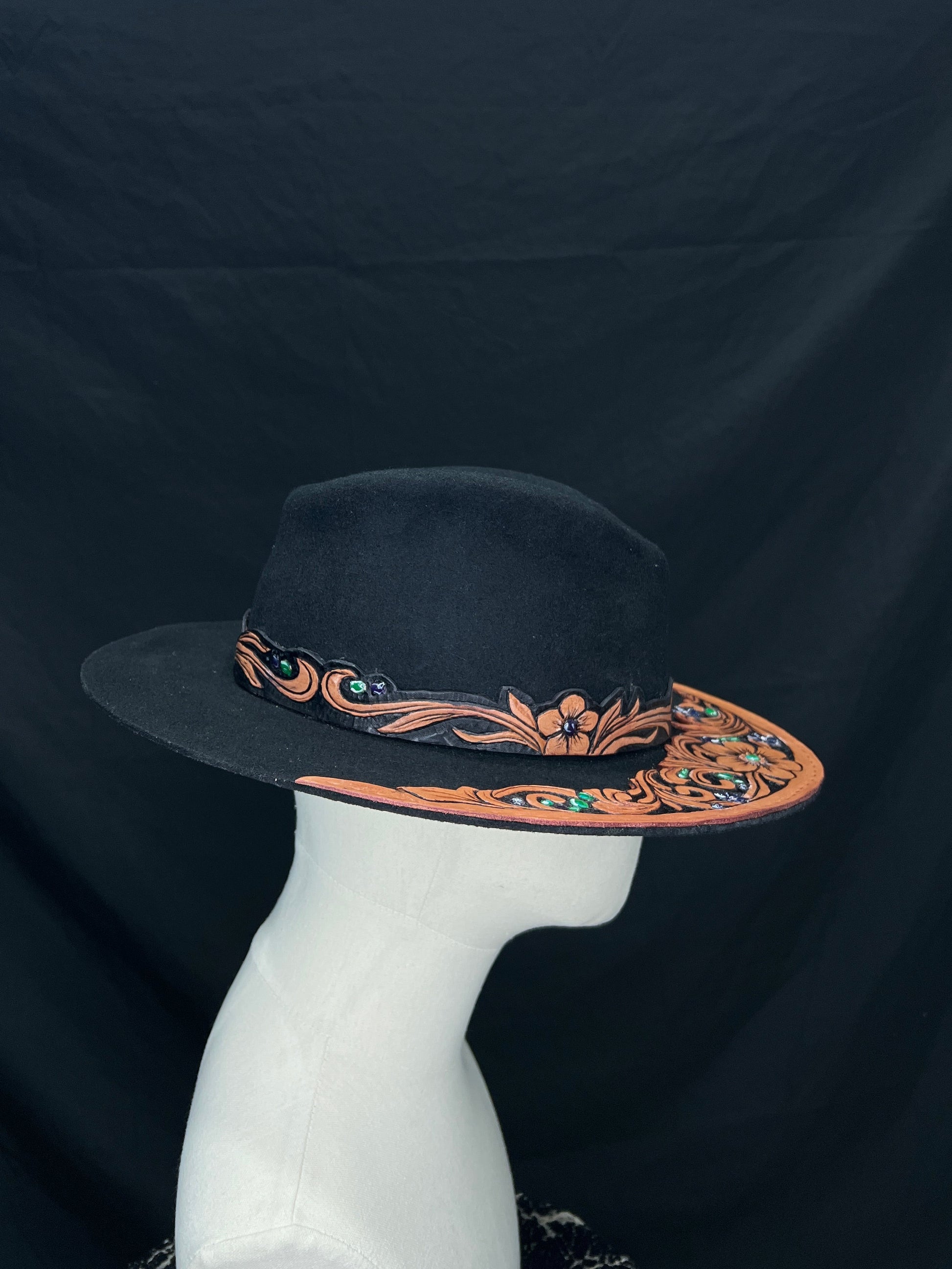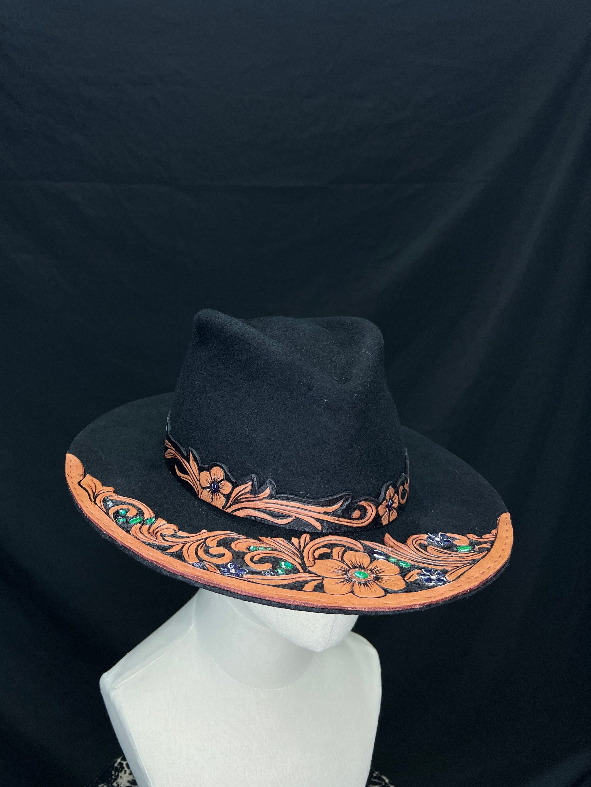 feltro nero profondo, pelle naturale scolpita con motivi floreali e barocchi, pietre verdi e blu incastonate a mano come piccoli frammenti di luce.